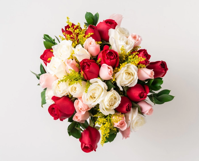 Três cores de rosas nacionais compõem o buquê perfeito para você presentear alguém especial, tornando qualquer momento inesquecível. Com ruscus, tango e acabamento em ráfia, ele fica mais belo e completo.
