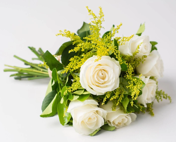 Na cor branca, a rosa remete à passividade e inocência. Esse buquê é entregue, sobretudo, em sinal de respeito. Com ruscus, tango e ráfia, a composição fica ainda mais elegante.