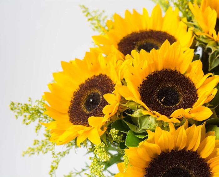 Nada mais alegre do que um buquê com os melhores Girassóis. Aqui na Bete você conta com a combinação com Ruscus e Tango no buquê com acabamento rústico de ráfia.