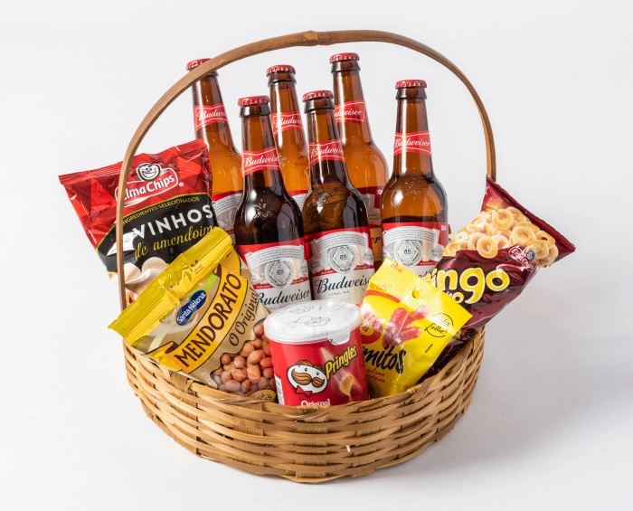 Cerveja e petiscos. Combinação perfeita! Essa cesta de bambu ou vime, é presente ideal para quem é fã. Com 6 unidades e petiscos como salgadinhos variados e salamitos deixe o dia da pessoa especial ainda mais leve e gostoso.
