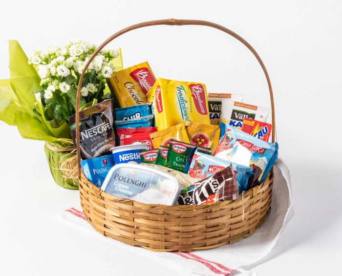 Esta cesta é a maneira perfeita de uma pessoa especial começar o dia! Ela é composta por queijo polenguinho, queijo philadelphia, 1 biscoito salgado, 1 biscoito doce, 1 suco, 1 pacote de torradas, 1 iogurte natural, chá, café solúvel, capuccino, 2 chocolates, 1 achocolatado, queijo, cream cheese e um vaso de Kalanchoe ou Kalandiva. Tem ainda um delicado acabamento em papel poli e fita de cetim ou um material correspondente.